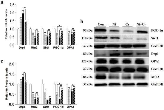 The effects of nickel and/or chromium exposure on the relative expression of genes and proteins related to mitochondrial dynamics are shown in Figure 5. Compared with the Con group, the mRNA and protein expression levels of Drp1 in all exposed groups showed a significant increase (p < 0.01). The mRNA and protein expression levels of Drp1 in the Ni + Cr group showed a significant decrease compared with those in the Cr group (p < 0.01). Compared with the Con group, the mRNA and protein expression levels of Mfn2 in all exposure groups showed a significant decreasing trend (p < 0.01). In the Ni + Cr group compared with the Cr group, the mRNA and protein expression levels of Mfn2 showed a significant increasing trend (p < 0.01). Compared with the Con group, the mRNA expression levels and protein expression levels of Sirt1 in all exposed groups showed a significant decreasing trend (p < 0.05 or p < 0.01). The mRNA expression levels of Sirt1 in the Ni + Cr group were significantly increased compared with that in the Cr group (p < 0.01). Compared with the Con group, the mRNA expression levels and protein expression levels of PGC-1α were significantly decreased in all exposed groups (p < 0.01). The mRNA expression levels and protein expression levels of PGC-1α in the Ni + Cr group were significantly increased compared with those in the Ni and Cr groups (p < 0.05 or p < 0.01). Compared with the Con group, the mRNA expression levels and protein expression levels of OPA1 in all exposed groups showed a significant decreasing trend (p < 0.01). The mRNA expression levels and protein expression levels of OPA1 in the Ni + Cr group showed a significant increasing trend compared with that in the Cr group (p < 0.05 or p < 0.01).