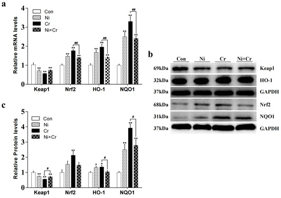 Effects of nickel–chromium on genes and proteins related to Nrf2 pathway in mice. (a) Relative mRNA levels of Keap1, Nrf2, HO-1 and NQO1. (b) Representative Western blot images of Keap1, Nrf2, HO-1 and NQO1. (c) Relative protein levels of Keap1, Nrf2, HO-1 and NQO1. Note: the symbol “*” indicates significant differences compared to the control group (* p < 0.05, ** p < 0.01); the symbol “#” indicates significant differences between the corresponding experimental groups (# p < 0.05, ## p < 0.01).