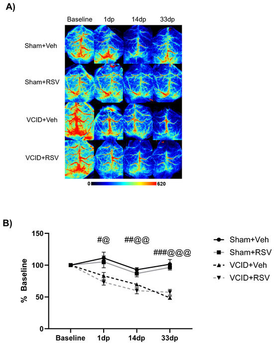 Due to previous reports indicating that RSV improves cerebral perfusion via angiogenesis [43,44], we first tested whether RSV was able to mitigate rCBF reductions following AC placement. We hypothesized that RSV treatment following the induction of cerebral hypoperfusion would mitigate global rCBF deficits through RSV-mediated alterations in vessel formation. To evaluate whether RSV can mitigate rCBF reductions, we compared the global rCBF in four groups: Sham + Veh, VCID + Veh, Sham + RSV, and VCID + RSV, as described in Figure 1.