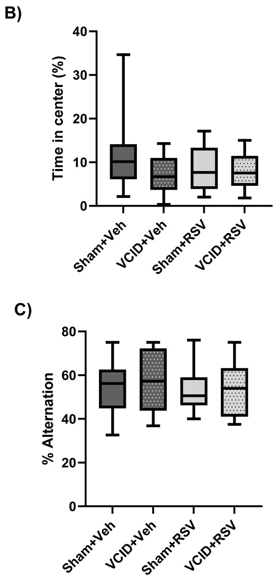 The hippocampus and entorhinal cortex play an important role in episodic memory and spatial navigation [45]. While reports of spatial working memory deficits have varied in animal models of VCID related to the paradigm timeframe [46,47,48], we hypothesized that our model of gradual carotid artery stenosis would induce spatial working memory deficits that would be ameliorated via RSV treatment. To assess discrepancies in spatial working memory, animals underwent Y-maze testing for spontaneous alternations. No significant differences in spontaneous alternation behavior were observed among the Sham + Veh, Sham + RSV, VCID + Veh, or VCID + RSV groups (58 ± 3, 53 ± 3, 66 ± 5, and 53 ± 5, % alternation, respectively) (Figure 3C). From these results, we determined that our model of VCID via a gradual AC stenosis of the CCAs did not induce spatial working memory deficits over the time course of our paradigm.