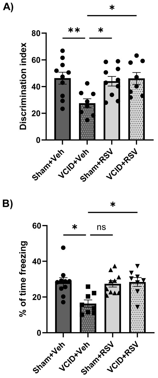 It is widely recognized that the hippocampal function is crucial for acquiring and expressing contextual conditioned fear memories [49]. Previous research has shown that resveratrol can protect against ischemia-related hippocampal synaptic dysfunctions [3] and contextual fear memories [28]. Therefore, we hypothesized that RSV treatment in our VCID model would ameliorate contextual fear memory deficits. Significant differences were found in freezing responses between the Sham + Veh, Sham + RSV, and VCID + RSV vs. VCID + Veh groups (28 ± 2, 27 ± 2, and 28 ± 3 vs. 16 ± 2, with the freezing index expressed as %, p < 0.05, respectively) (Figure 4B).