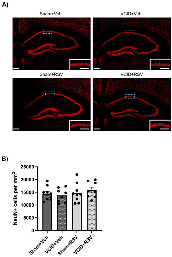 Previous reports of the gradual CCA stenosis model from AC implantation have indicated no significant reductions in the neuronal population of CA1 [11]. However, due to the hippocampal CA1 region’s importance in spatial and contextual memory [50], we assessed the VCID model’s influence on the neuronal survival of hippocampal CA1. No significant differences were found in the CA1 neuronal counts in the VCID animals compared to the Sham animals, regardless of the RSV or Veh treatments (the Sham + Veh, Sham + RSV, VCID + Veh, or VCID + RSV groups: 14,476 ± 908, 13,791 ± 956, 14,732 ± 12,234, and 15,868 ± 1093, CA1 neurons per mm2, respectively) (Figure 5B).