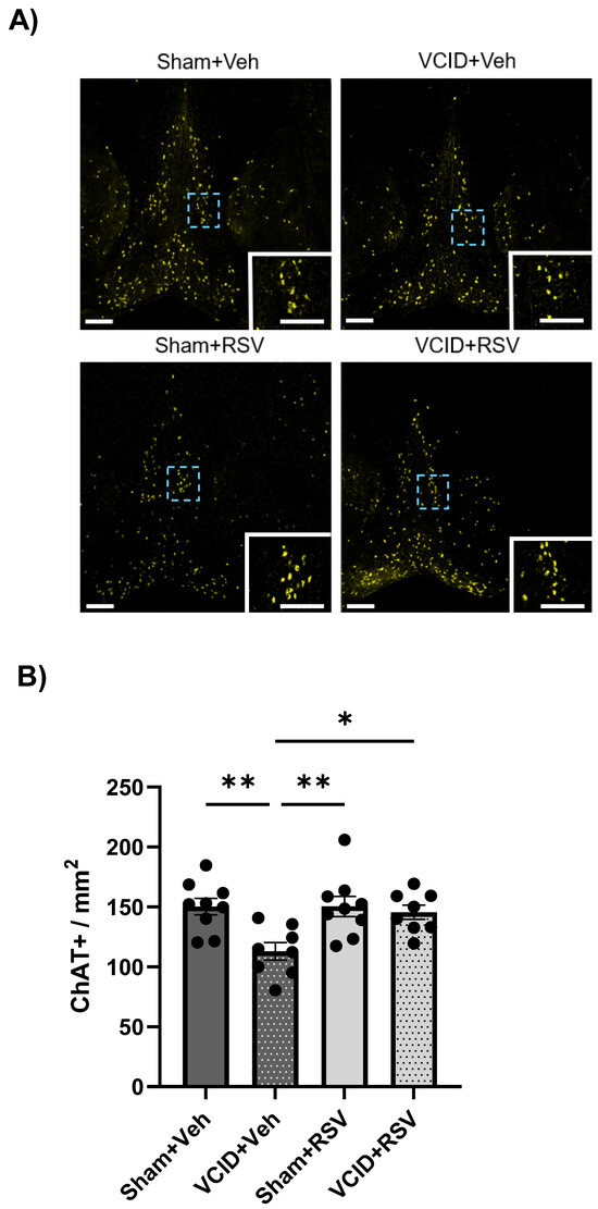 In a previous study, we found that RSV mitigated cognitive deficits following focal cerebral ischemia and that this protection was correlated with the preservation of cholinergic neurons in the septal nuclei [28]. To assess whether VCID induces pathology in cholinergic neurons in the septal nuclei and whether RSV could mitigate this pathology, we analyzed the cholinergic populations in the medial septum at +0.88 mm relative to the Bregma (Figure 6A). Significant differences were found in the medial septal cholinergic populations at +0.88 relative to the Bregma among the Sham + Veh, Sham + RSV, and VCID + RSV groups vs. the VCID + Veh group (150 ± 7, 151 ± 9, and 146 ± 6 vs. 113 ± 7, ChAT + neurons/mm2, p < 0.05, respectively) (Figure 6B). These results support our hypothesis that RSV ameliorates cognitive impairments in VCID via mitigating cholinergic neuronal losses in the medial septum.