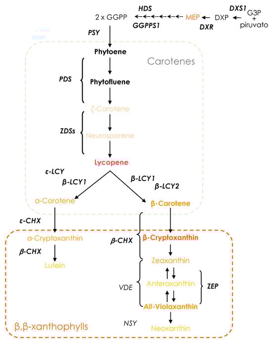 The carotenoid biosynthesis pathway has been well characterised [17,19,20,21,22]. Carotenoids are derived in light-grown plants from the precursor isopentenyl diphosphate (IPP) and its isomer dimethylallyl diphosphate (DMAPP) from the methyl-D-erythritol 4-phosphate (MEP) pathway, which occurs in the plastids [23,24]. The first step is catalysed by DXP synthase (DXS) to produce deoxyxylulose 5-phosphate (DXP), which is reduced by DXP reductoisomerase (DXR) and yields MEP (Figure 1). MEP is converted into the precursors IPP and DAMPP by the sequential action of different enzymes. The condensation of these precursors generates geranylgeranyl pyrophosphate (GGPP). Through the action of phytoene synthase (PSY), two GGPPs are converted into the colourless carotene named phytoene, which is desaturated to phytofluene by phytoene desaturase (PDS). Phytofluene is desaturated by ζ-carotene desaturase (ZDS), generating the red-coloured carotene lycopene, which is cyclised by lycopene ε-cyclase (εLCY) and lycopene β-cyclase (βLCY) to produce α-carotene or by the enzyme βLCY to generate β-carotene. In orange fruits, the accumulation of carotenoids during the maturation process is coordinated by the induction of βLCY2 expression, concomitantly with a decrease in εLCY expression, favouring a shift to β,β-xanthophylls production. The β-carotene hydroxylase (βCHX) enzyme acts on β-carotene, yielding zeaxanthin via β-cryptoxanthin, followed by the epoxidation reaction of zeaxanthin via zeaxanthin epoxidase (ZEP) to generate violaxanthin, the most abundant carotenoid in sweet orange juices.