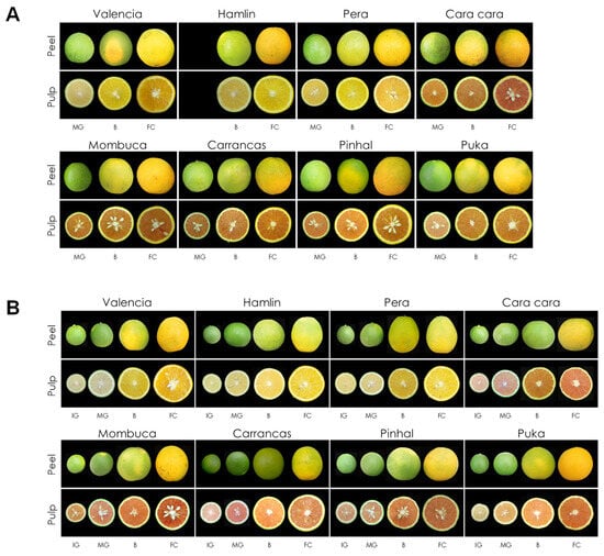 External and internal appearance of Valencia, Hamlin, Pera, Cara cara, Mombuca, Carrancas, Pinhal and Puka fruits (C. sinensis L. Osbeck) in two different seasons: (A) Season 1 (2021/2022) and (B) Season 2 (2022/2023). The physiological fruit stages are indicated: IG (Immature-green), MG (Mature-green), B (breaker) and FC (Full-color).