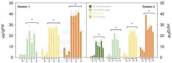 Changes in carotenoid contents in the pulp during development and maturation of Valencia (Va), Hamlin (Ha), Pera (Pe), Cara cara (Cc), Mombuca (Mo), Carrancas (Ca), Pinhal (Ph) and Puka (Pk) fruits (C. sinensis L. Osbeck) in two different seasons. The 10 samples analysed correspond to the developmental and maturation stages indicated in Figure 2. The physiological fruit stages are indicated: IG (immature-green), MG (mature-green), B (breaker) and FC (full-colour). The data are means ± SD of at least three independent measurements. Statistical analyses were performed using analysis of variance (ANOVA) and an asterisk above the bars indicates significantly different values at p ≤ 0.01 (n.d.: non detected).
