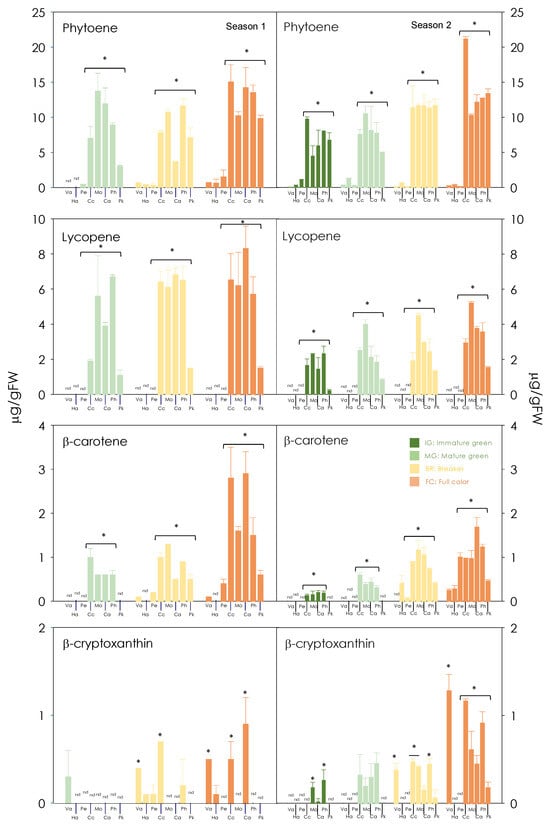 Carotenoid content of phytoene, phytofluene, β-carotene and β-cryptoxanthin in the pulp during development and maturation of Valencia (Va), Hamlin (Ha), Pera (Pe), Cara cara (Cc), Mombuca (Mo), Carrancas (Ca), Pinhal (Ph) and Puka (Pk) fruits (C. sinensis L. Osbeck) in two different seasons. The samples analysed correspond to the developmental and maturation stages indicated in Figure 2. The physiological fruit stages are indicated: IG (immature-green), MG (mature-green), B (breaker) and FC (full-colour). The data are means ± SD of at least three independent measurements. Statistical analyses were performed using analysis of variance (ANOVA) and an asterisk above the bars indicates significantly different values at p ≤ 0.01 (n.d.: non detected).