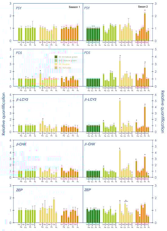Quantitative RT-PCR analysis of the expression of PSY, PDS, β-LCY2 β-CHX and ZEP genes in the pulp during development and maturation of Valencia (Va), Hamlin (Ha), Pera (Pe), Cara cara (Cc), Mombuca (Mo), Carrancas (Ca), Pinhal (Ph) and Puka (Pk) fruits (C. sinensis L. Osbeck) in two different seasons. The samples analysed correspond to the developmental and maturation stages indicated in Figure 2. The physiological fruit stages are indicated: IG (immature-green), MG (mature-green), B (breaker) and FC (full-colour). Statistical analyses were performed using analysis of variance (ANOVA) and an asterisk above the bars indicates significantly different values at p ≤ 0.01.
