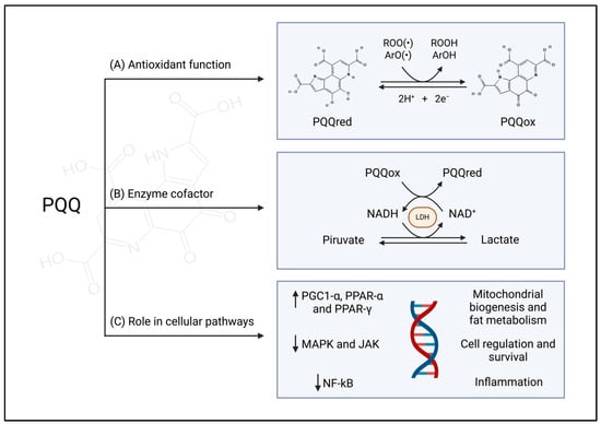General properties of PQQ: (A) Antioxidant function: PQQ in its reduced state acts as a potent antioxidant, efficiently catalyzing electron transfer reactions. (B) Enzyme cofactor: PQQ serves as an enzyme cofactor in lactate dehydrogenase. (C) Role in cellular pathways: PQQ influences mitochondrial biogenesis and fat metabolism (by regulating PGC-1α, PPAR-α, and PPAR-γ), cell regulation (by regulating MAPK and JAK pathways), and inflammation (through the modulation of NF-κB). (ArO(•)): aroxyl radicals; NAD+/NADH: nicotinamide adenine dinucleotide oxidized and reduced; JAK: Janus kinase; LDH: Lactate dehydrogenase; MAPK: mitogen-activated protein kinase; NF-κB: nuclear factor kappa-light-chain-enhancer of activated B cells; PGC-1α: proliferator-activated receptor gamma coactivator 1-alpha; PPAR-α and PPAR-γ: Peroxisome proliferator-activated receptors alpha and gamma; PQQox: pyrroloquinoline quinone; PQQred: pyrroloquinoline quinol; (ROO(•)):Peroxyl radicals. Created with BioRender.com, accessed on 10 August 2024.