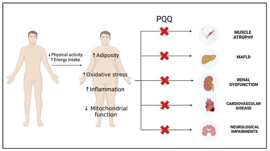 PQQ exhibits anti-inflammatory properties that appear beneficial for addressing obesity-related complications, including metabolic-dysfunction-associated fatty liver disease (MAFLD), kidney dysfunction, cardiovascular disease, and neurological impairments (Figure 2).