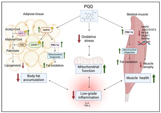 Representation of the main pathways involved in the multiple effects of PQQ on adipose metabolism, muscle health, and mitochondrial function. Up green arrows indicate an increase while down red arrows a decrease. Truncated black arrows suggest inhibitory activity. ACC, acetyl-CoA carboxylase; AMPK, AMP-activated protein kinase; FAS, fatty acid synthase; JAK, Janus kinase; MAFbx, muscle atrophy F-box; MAPK, mitogen-activated protein kinase; MuRF-1, muscle-specific RING finger-1; NF-κB, nuclear factor kappa-light-chain-enhancer of activated B cells; PGC-1α, proliferator-activated receptor gamma coactivator 1-alpha; SREBP, sterol regulatory element-binding protein 1. Created with BioRender.com, accessed on 31 July 2024.