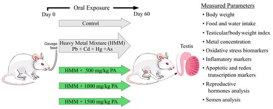 Male albino rats were randomly divided into five groups, consisting of seven rats in each group. Both the untreated and treated rat groups received their respective, once daily, oral treatment doses by gavage for 60 days (Figure 1). The heavy metal mixture (HMM) used consisted of the following metals and dosages per kg of body weight: lead (II) chloride (20 mg/kg), mercury chloride (0.40 mg/kg), cadmium chloride (1.61 mg/kg), and sodium arsenite (10.0 mg/kg) [,,].