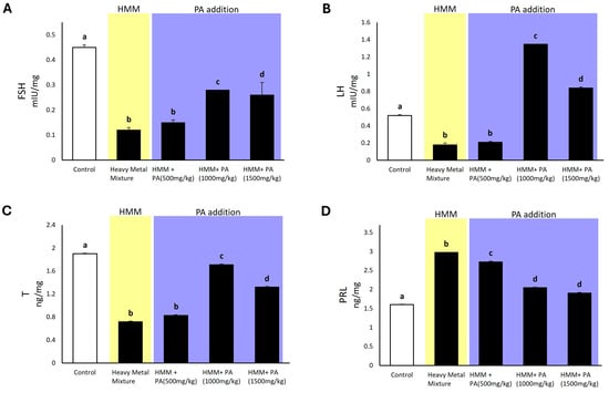 The impact of Prosopis africana (PA) on hormonal profile in plasma of male albino rats exposed to a heavy metal mixture (HMM) for 60 days. (A) the effect of PA on follicle-stimulating hormone (FSH). (B) The effect of PA on luteinizing hormone (LH). (C) The effect of PA on testosterone (T). (D) The effect of PA on prolactin (PRL). Values are mean ± SD, N = 7. Bars having the same letter notations (a, b, c, d) are not significantly different from each other (p ≥ 0.05).