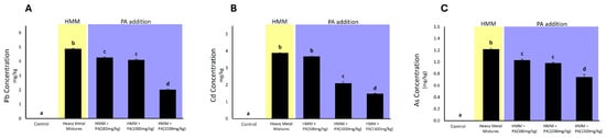 The concentration of heavy metal mixture (HMM) with and without Prosopis africana (PA) aqueous extracts on testicular tissue. (A) the concentration of lead (Pb) in testicular tissue exposed to HMM alone and the combination HMM and PA. (B) The concentration of cadmium (Cd) in testicular tissue exposed to HMM alone and the combination HMM and PA. (C) The concentration of arsenic (As) in testicular tissue exposed to HMM alone and the combination HMM and PA. Values are mean ± SD, N = 7. Bars having the same letter notations (a, b, c, d,) are not significantly different from each other (p ≥ 0.05).
