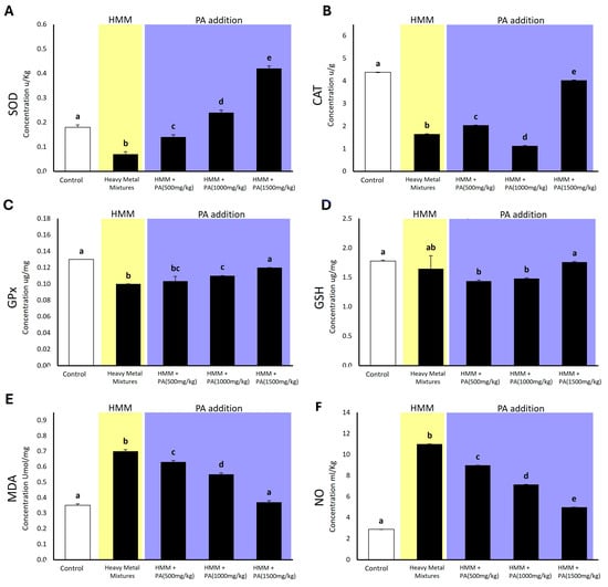 The impact of Prosopis africana (PA) on oxidative stress markers in male albino rats exposed for 60 days to a heavy metal mixture (HMM). (A) The effect of PA on SOD. (B) The effect of PA on CAT. (C) The effect of PA on GPx. (D) The effect of PA on GSH. (E) The effect of PA on MDA. (F) the effect of PA on NO. Values are mean ± SD, N = 7. Bars sharing the same letter notations (a, b, c, d, e) are not significantly different from each other (p ≥ 0.05).