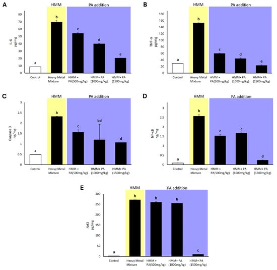 The impact of Prosopis africana (PA) on expression of pro-inflammatory factors and apoptotic and transcriptional factors in male albino rats exposed to a heavy metal mixture (HMM) for 60 days. (A) The effect of PA on interleukine-6 (IL-6). (B) The effect of PA on tumor necrotic factor alfa (TNF-α). (C) The effect of PA on caspase-3. (D) The effect of PA on nuclear factor kappa B (NF-κB). (E) The effect of PA on transcriptional factor Nrf2. Values are mean ± SD, N = 7. Bars sharing the same letter notations (a, b, c, d, e) are not significantly different from each other (p ≥ 0.05).