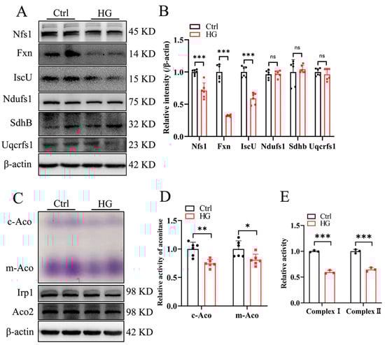High-glucose treatment downregulates iron–sulfur (Fe-S) cluster biogenesis and activities of Fe-S-containing enzymes in RSC96 cells. (A–D), RSC96 cells were cultured in DMEM with 5.5 mM glucose (Crtl) or 50 mM glucose (high glucose, HG) for 2 d. (A,B) The expression of the iron–sulfur cluster-related proteins detected via Western blotting (A), quantified in (B). (C,D) Cytosolic aconitase (c-Aco) and mitochondrial aconitase (m-Aco) activities (purple density) and the corresponding protein levels (pair set: c-Aco and Irp1; m-Aco and Aco2), quantified in (D). (E) The activities of mitochondrial complexes I and II. Data were normalized to the Ctrl group. Values are shown as the mean ± SD. n = 3–6. The t-test was used for significance. KD: molecular weight in kilodaltons, the same in later figures. ns p > 0.05, * p < 0.05, ** p < 0.01, and *** p < 0.001.