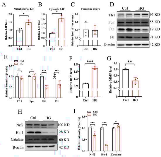 We wonder whether the reduction in Fe-S biogenesis is attributed to iron deficiency. Then, the intracellular iron and oxidative stress were evaluated. Surprisingly, the labile iron pool (LIP) was increased in both the cytosol and mitochondria (Figure 2A,B). However, the cellular iron did not alter between the control (Ctrl) and HG group based on the ferrozine assays (Figure 2C), which revealed the labile iron and ferritin iron. Interestingly, the expression levels of ferritin subunits H and L (Fth and Ftl) significantly decreased around half after HG treatment, whereas Trf1 and Fpn remained constant (Figure 2D, quantified in Figure 2E), suggesting an increased Fenton reaction rate to produce ROS, a crucial pathophysiological pathway of DPN []. After HG treatment, the ROS levels significantly increased by ~60%, as detected by a fluorescent DCFH-DA probe (Figure 2F), and the mitochondrial membrane potential (MMP) decreased by ~20% (Figure 2G). Then, the expression of oxidative stress-related proteins was detected, and we found a significant decrease in heme oxygenase 1 (Ho-1) and nuclear factor erythroid 2-related factor 2 (Nrf2), but not catalase (Figure 2H, quantified in Figure 2I). These results indicate that the elevated production of ROS was caused by the increase in labile iron after HG treatment.