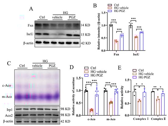 Multiple PPARγ agonists, including PGZ, are capable of increasing the expression of FXN in the models of Friedreich Ataxia [,], a neurological disorder caused by FXN deficiency. To investigate whether PGZ treatment affects the expression of FXN in the DPN cell model, we treated the RSC96 cells with high-concentration glucose (HG, 50 mM) for 24 h with or without PGZ (10 μM) and found that PGZ treatment increased the protein levels of Fxn and IscU in HG-treated RSC96 cells (Figure 3A, quantified in Figure 3B). Consistent with this, the enzymatic activities of both cytosolic and mitochondrial aconitases and mitochondrial complexes (I and II) were significantly higher after PGZ treatment (Figure 3C–E). These results demonstrate that PGZ restored the synthesis of Fe-S clusters and enzymatic activities of Fe-S proteins.