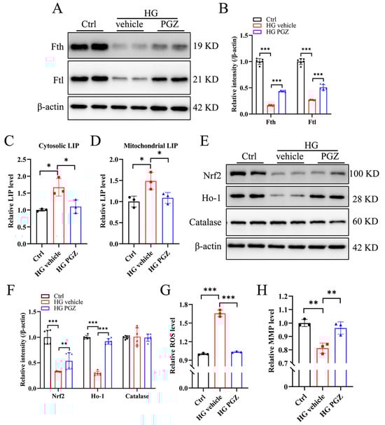The stability of the Fe-S cluster is sensitive to intracellular levels of ROS. The restoration of Fe-S enzymatic activities by PGZ suggests the recovery of cellular LIP and oxidative stress. As shown in Figure 4A–D, PGZ treatment significantly increased the protein expression of Fth and Ftl and decreased the cytosolic and mitochondrial LIP. In addition, the expressions of Nrf2 and Ho-1 increased after PGZ treatment (Figure 4E, quantified in Figure 4F) in accord with the reduced levels of ROS and increased MMP following PGZ treatment (Figure 4G,H).