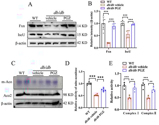 To investigate the relevant effects of PGZ on Fe-S biogenesis in vivo, we determined the expression of Fxn and IscU in db/db mice after PGZ treatment. db/db mice are born with no apparent abnormalities in general appearance or behavior, but they start to develop obesity and glucose intolerance around the age of 4–6 weeks []. db/db mice at the age of 16 weeks have pathological changes in their sciatic nerve (SCN) []. Here, the db/db mice at 12 weeks were treated with vehicle or PGZ (25 mg/kg/d, oral administration by gavage) for 4 weeks. Consistent with in vitro experimental results from RSC96 cells with high-glucose treatment, the expression of Fxn and IscU significantly decreased in the SCN of db/db mice, and PGZ treatment reversed it well (Figure 5A, quantified in Figure 5B). We then determined whether PGZ improved the activities of mitochondrial Fe-S cluster-containing enzymes and found that both the activities of mitochondrial aconitase and complex I and complex II significantly increased in the SCN of the db/db mice (Figure 5C–E).