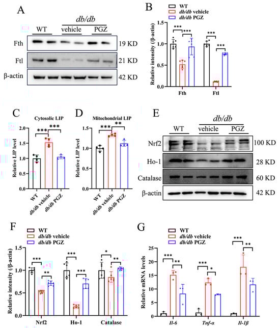 Pioglitazone treatment improves iron homeostasis and alleviates inflammation and oxidative stress in db/db mice. (A–E) Db/db mice at 12 weeks were treated with vehicle or PGZ (25 mg/kg/d, oral administration by gavage) for 4 weeks. (A) The protein expression of Tfr1, Fpn, Fth, and Ftl detected via Western blotting, quantified in (B). (C,D) The relative levels of cytosolic and mitochondrial LIP. (E) The expression levels of oxidative stress-related proteins Nrf2, Ho-1, and catalase detected via Western blotting, quantified in (F). (G) mRNA expression levels of inflammation-related genes Il-6, Tnf-α and Il-1β. Data were normalized to the WT group. n = 3–6. Values are shown as the mean ± SD. ANOVA was used for significance. * p < 0.05, ** p < 0.01, and *** p < 0.001.