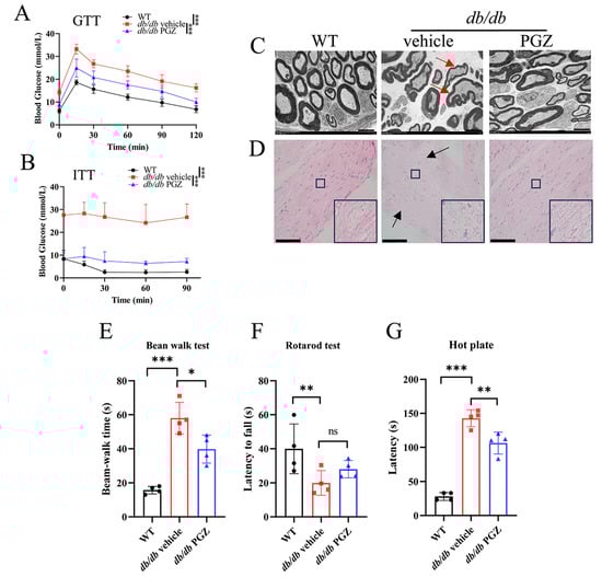 Since DPN is usually accompanied by axon degeneration in various nerves, including the SCN [,,], we investigated whether PGZ treatment has a protective effect on diabetic axon degeneration. Transmission electron microscopy was used to observe the ultrastructure of the mouse SCN. Representative cross-section images of axons showed that the myelin sheath was irregular and thinner in the db/db mice than in the WT mice and reversed by PGZ treatment, as shown in Figure 7C. The structure of SCN fibers was disordered and damaged, in particular, with rupture/injury in db/db mice, and it was significantly improved by PGZ treatment (Figure 7D), revealed through histological H&E staining.