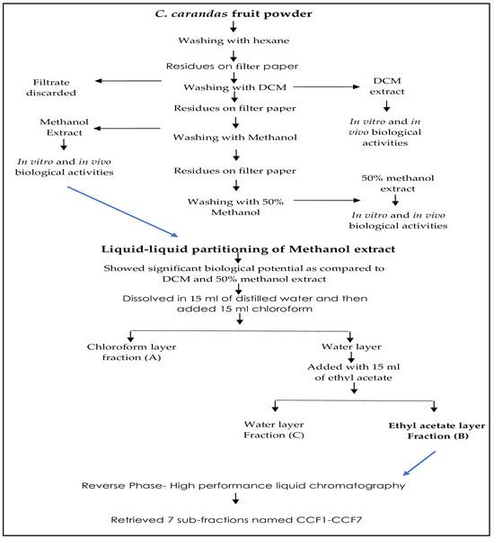 C. carandas fruit methanol extract exhibiting higher activities was further fractionated using the liquid-liquid partitioning technique using ethyl acetate, dichloromethane, and water. This led to three fractions: fraction A (chloroform), fraction B (ethyl acetate), and fraction C (water).