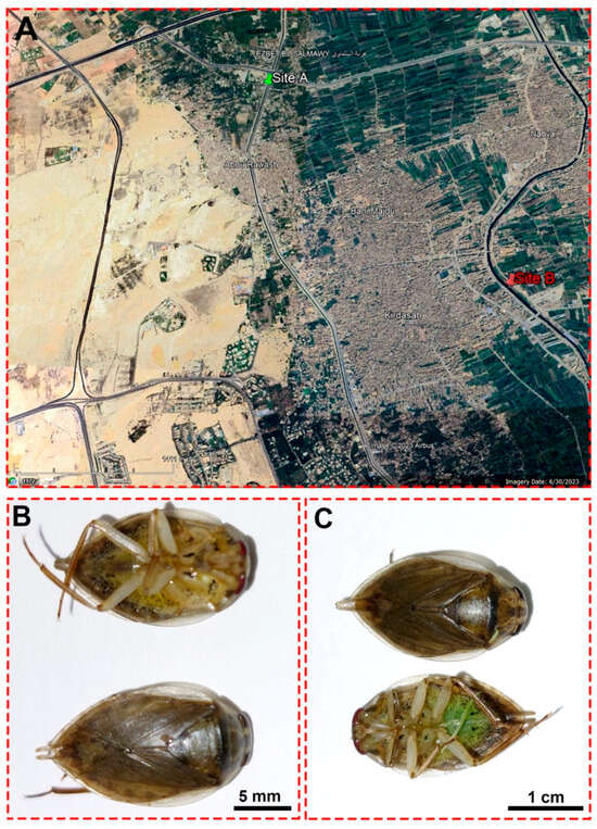 (A) A satellite image from Google Earth shows the locations of the Al Mansoureya (site A) and Al Marioteya (site B) canals. (B) An adult male Ilyocoris cimicoides and (C) adult female Ilyocoris cimicoides displaying their morphological features.