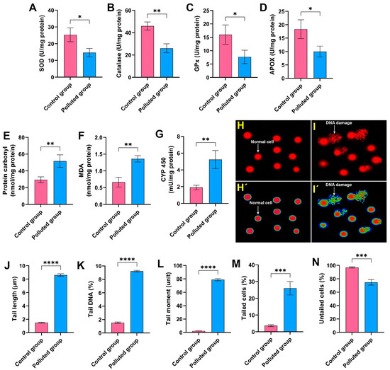 Assessment of (A) superoxide dismutase (SOD), (B) catalase, (C) glutathione peroxidase (GPx), (D) ascorbate peroxidase (APOX), (E) protein carbonyl, (F) malondialdehyde (MDA), and (G) cytochrome P450 (CYP 450) in the midgut homogenates of creeping water bugs from the polluted site compared to those from the clean site. (H,I) depict the image of the comet assay of cells from the midgut tissues of creeping water bugs from control and polluted sites, respectively, before being analyzed by ImageJ Fiji software (https://imagej.net/software/fiji/downloads) (accessed on 1 June 2024), as shown in (H’,I’). The comet evaluation results show (J) tail length, (K) DNA percentage in the comet tail, (L) tail moment, (M) tailed cells, and (N) untailed cells. All biochemical analyses were conducted from 3 to 6 replicates. To obtain the comet results, we randomly examined 100 comets per slide. Data were analyzed following the t-test, and all results are presented as mean ± SD. **** p < 0.0001, *** p < 0.001, ** p < 0.01, and * p < 0.05 indicate the significant differences between various parameters, which were estimated in the midgut tissues of creeping water bugs from site A versus site B.
