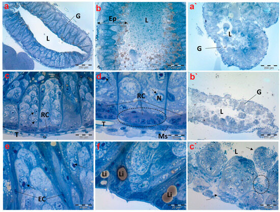 Photomicrographs of semithin sections exhibiting histological structures of the midgut of creeping water bugs collected from the reference site (A) and polluted site (B). (a–f) delineate the histological properties of the midgut of aquatic bugs from a clean site. (a) illustrates a transverse section through the midgut (G), and its Lumen (L). (b) shows the width of the midgut epithelium (Ep) and the contents within its lumen (L). (c,d) depict higher magnifications for the midgut, showing the muscle layer (Ms), regenerative cysts (RCs), and proliferative cells with normal nuclei. (arrows) nucleus (N), tracheole (T). (e) portrays active cell proliferation, proliferative cells (arrows), and endocrine cells (ECs). (f) exhibits lipid granules (Li) on the apical surface. (a`–c`) depict the histological anomalies in the midgut (G) of bugs from polluted water, demonstrating fragmentation of the midgut epithelium in the lumen (L) (arrow), lysis and separation of the muscle layer from the epithelium (curved arrow), and signs of epithelium lysis (encircled). (a) (scale bar = 200 µm and magnification ×100), (b) (scale bar = 200 µm and magnification ×100), (c) (scale bar = 50 µm and magnification ×400), (d) (scale bar = 20 µm and magnification ×1000), (e) (scale bar = 20 µm and magnification ×1000), (f) (scale bar = 20 µm and magnification ×1000), (a`) (scale bar = 200 µm and magnification ×100), (b`) (scale bar = 200 µm and magnification ×100), and (c`) (scale bar = 50 µm and magnification ×400).