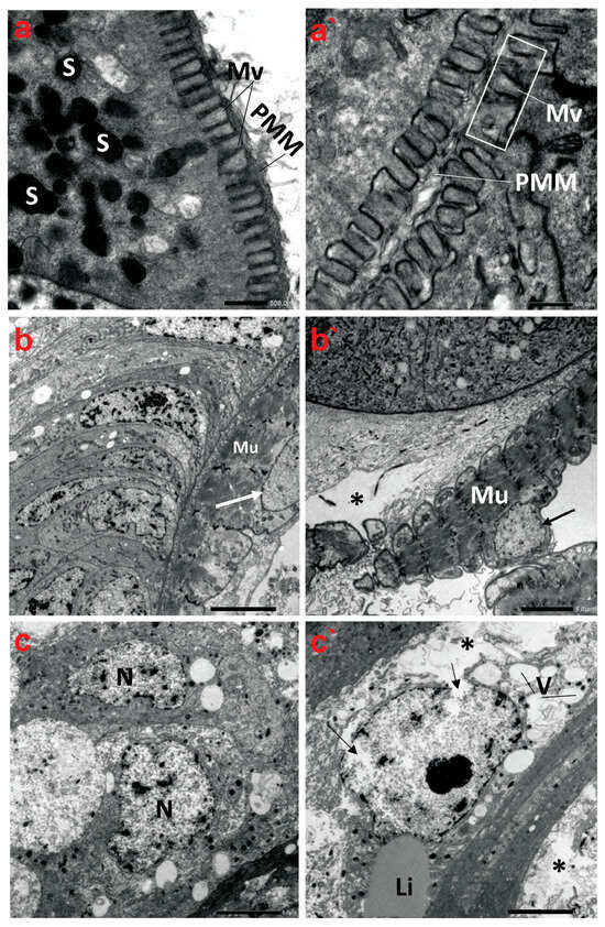 By contrast, the ultrastructure of the polluted midgut showed substantial anomalies in the midgut epithelium, such as nuclear lysis, vacuolization, low cytoplasmic content, and loosening of cells, followed by necrosis and the disintegration of regenerative epithelial cells, as delineated in Figure 5a`–c`. The midgut epithelium’s brush border also underwent alterations, showing a marked reduction in number compared to the control group at the same magnification. Indeed, the microvilli are significantly shorter, misshapen, and may be non-functional. In addition, the microvilli are irregularly thick and distorted (Figure 5a`). Evidently, the basal lamina and the muscle layer were in some parts of the midgut separated from each other. Figure 5b` shows that the circular muscles become morphologically altered, thinner, disintegrated, and sometimes separated from the previous connective tissue layer. In addition, their nuclei emerged indented and irregular in shape. The midgut epithelium from the polluted water showed irregularly shaped nuclei in advanced stages of degeneration, with indented and ruptured nuclear envelopes, lysis of the nuclear content, and cytoplasmic proteolysis. A rupture of the cell membrane and some signs of necrosis in both the nuclei and cytoplasm of the epithelial cells were detectable. Large vacuoles were present in the epithelial layer, and nidi were almost absent (Figure 5c`).