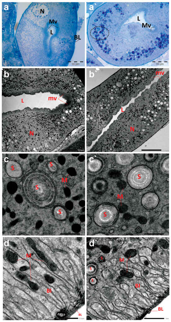 Photomicrographs of semithin sections and transmission electron micrographs of Malpighian tubules (MTs) of creeping water bugs collected from the reference site (A) and the polluted site (B). (a) presents histological properties, and (b–d) exhibit ultrastructure attributes of MTs of creeping bugs from the clean site. (a) reveals a semithin cross-section of MTs with a clear cytoplasm, spherical nucleus (N), a lumen (L) lining with microvilli (MV), and basal folds (BL) in the MTs distal part. (b) exposes the ultrastructure of MTs, microvilli (mv), lumen (L), and nucleus (N). (c) shows spherites (S) and abundant mitochondria (M) in the cytoplasm around them. (d) demonstrates the basal labyrinth (Bl) of the epithelial cells of MT. Remarkably, mitochondria (M) between the basal labyrinth (Bl) and the absence of spherites could be discernible. The distal part of the MTs appeared with several basal folds (BL). (a`) shows histological abnormalities, and (c`,d`) illustrate the ultrastructure deformities of MTs of creeping bugs from the polluted site. (a`) depicts a semithin cross-section of the MT with numerous cytoplasmic inclusions (encircled), a lumen (L) lining with microvilli (MV). (b`) shows the ultrastructure of the MT, manifesting the severe shrinkage in size of MT compared to the control (microvilli (mv), lumen (L), and nucleus (N)). (c`) shows a higher number of spherites (S) and a lower number for mitochondria (M), while (d`) displays spherites (S) in the basal part of the basal labyrinth (Bl) (mitochondria (M) and basal folds (BL)). (a) (scale bar = 20 µm and magnification ×1000), (b) (scale bar = 10 µm and magnification ×600), (c) (scale bar = 1.0 µm and magnification ×8000), (d) (scale bar = 1.0 µm and magnification ×8000), (a`) (scale bar = 20 µm and magnification ×1000), (b`) (scale bar = 10 µm and magnification ×800), (c`) (scale bar = 1.0 µm and magnification ×8000), and (d`) (scale bar = 1.0 µm and magnification ×8000).
