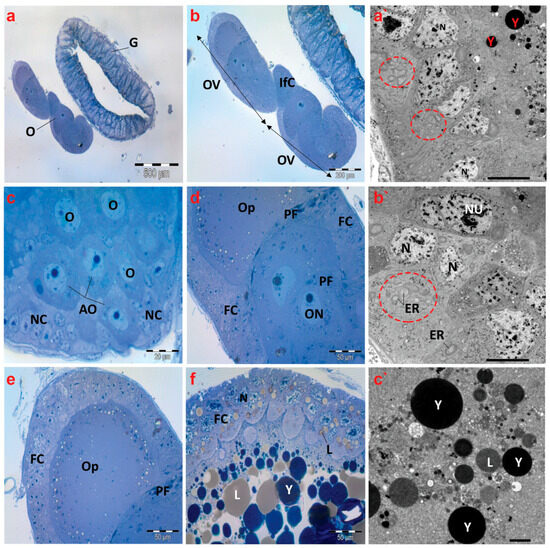 Photomicrographs of semithin sections and transmission electron micrographs of ovarioles of creeping water bugs collected from the reference site (A). (a) exhibits a cross-section of the gut (G) and ovary (O). (b) indicates a higher magnification of (a), showing two ovarioles (OV) and interfollicular cells (Ifc). (c) illustrates a cross-section of the tropharium, signifying arrested oocytes (AO), oocytes (O), and nurse cells (NC) or trophocytes. (d) presents three previtellogenic oocytes, spindle-shaped prefollicular cells (PF), oocyte nucleus (ON), follicular cells (FC), and ooplasm (OP). (e) demonstrates a previtellogenic oocyte surrounded by follicular cells (FC), with ooplasm (OP) and spindle-shaped prefollicular cells (PF). (f) shows a vitellogenic oocyte surrounded by follicular cells (FC), with nucleus (N), ooplasm filled with yolk granules (Y) and lipid droplets (L). (a`,b`) exhibit electron transmission micrographs of ovarioles, manifesting the nucleus (N), binucleated follicular cells (Nu), yolk granules (Y), and numerous endoplasmic reticula (ER) (encircled), while (c`) shows yolk granules (Y) and lipid droplets (L). (a) (scale bar = 500 µm and magnification ×40), (b) (scale bar = 200 µm and magnification ×100), (c) (scale bar = 20 µm and magnification ×1000), (d) (scale bar = 50 µm and magnification ×400), (e) (scale bar = 50 µm and magnification ×400), (f) (scale bar = 50 µm and magnification ×400), (a`) (scale bar = 10 µm and magnification ×800), (b`) (scale bar = 10 µm and magnification ×800), and (c`) (scale bar = 2.0 µm and magnification ×2000).