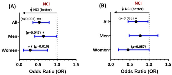 3.2. Multivariable Ferritin Associations with Global NCI and Neurocognitive Performance and Interaction Effects by Sex