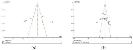 At the end of the meta-analysis, LmW supplementation showed a positive effect on MDA control, with the ES directly proportional to the supplementation dose: the higher the dose, the larger the effect size. LmW supplementation evidenced a moderate effect on malondialdehyde (MDA) control (ES = −0.53). Despite this magnitude in the cellular antioxidant effect, manifested through MDA control, LmW supplementation at low doses showed a small effect on this outcome (ES = −0.39) [,,,]. In this context, He et al. [] observed a reduction of 14.02%, 17.49%, and 29.29% in MDA levels in the groups supplemented with LmW in doses equivalent to 50, 100, and 200 mg/kg, respectively, when compared to the exercise control group (p < 0.05). In the study of Tang et al. [], all three experimental groups showed lower MDA levels than the PL group. However, only the group supplemented with a dose equivalent to 100 mg/kg body mass presented significant decreases in MDA concentrations (p < 0.01). In the study of Yang et al. [], after supplementation with LmW in the form of N-benzyloleamide and N-benzylinoleamide and after a swimming test to exhaustion, significantly lower levels of muscle MDA were observed in the groups receiving the highest doses of LmW. In turn, after supplementation with LmW equivalent to 40 mg/kg, Zheng et al. [] reported lower MDA levels than CG. In parallel, the magnitude of the cellular antioxidant effect after high-dose LmW supplementation was −1.69 (large effect) on MDA control [].