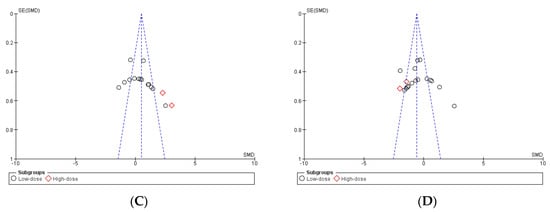 The publication bias of the six meta-analyzed studies was assessed using Egger’s statistical test. This test determined the presence of bias at p < 0.05 []. Funnel plots were created to interpret the general effect, followed by an Egger’s statistic to confirm or refute publication bias. Egger’s analysis suggested that only the reduced glutathione did not show publication bias. The results of Egger’s test are presented below: (A) reduced glutathione: z = 1.39, p = 0.17 [,]; (B) glutathione peroxidase: z = 3.44, p = 0.0006 [,,,]; (C) superoxide dismutase: z = 2.47, p = 0.01 [,,,]; (D) malondialdehyde: z = 2.14, p = 0.03 [,,,,] (Figure 2, panels A, B, C, and D).
