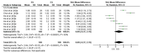 Two studies were considered for this analysis [,]. The research by Choi et al. [] was considered two independent studies since it considered two EGs (a and b). Meanwhile, the study by He et al. [] was considered six independent studies since it considered six EGs (a, b, c, d, e, and f). Consequently, to calculate the low-dose effect of LmW on reduced glutathione, this meta-analysis considered the eight comparisons as independent studies. Figure 3 shows the small effect of a low dose of LmW on reduced glutathione concentrations (SMD = 0.89; CI = 95%: −0.37–2.15; p = 0.17). The meta-analysis showed a high heterogeneity among the studies reviewed (I2 = 93%; p < 0.00001).