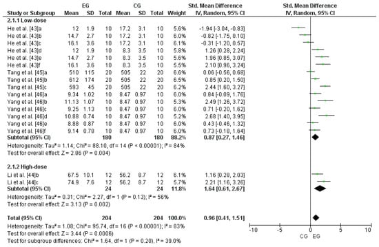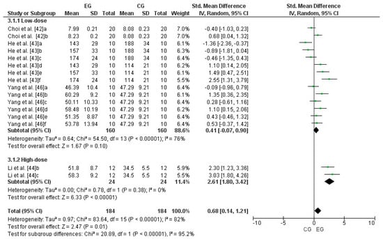 Four studies were considered for this analysis [,,,]. Concerning high-dose LmW, the research by Li et al. [] was considered two independent studies because it considered two EGs (b and c). Concerning low-dose LmW, the research by Choi et al. [] was considered two independent studies since it considered two EGs (a and b). The study by He et al. [] was considered six independent studies since it considered six EGs (a, b, c, d, e, and f). Finally, the research by Yang et al. [] was considered six independent studies since it considered six EGs (a, b, c, d, e, and f). Consequently, to calculate the high-dose effect of LmW on superoxide dismutase, this meta-analysis considered the two comparisons as independent studies, showing an SMD = 2.61 (CI = 95%: 1.80–3.42; p = 0.00001) and low heterogeneity among the studies reviewed (I2 = 0%; p = 0.38). Likewise, to calculate the low-dose effect of LmW on superoxide dismutase, this meta-analysis considered the fourteen comparisons as independent studies, showing an SMD = 0.41 (CI = 95%: −0.07–0.90; p < 0.00001) and a high heterogeneity among the studies reviewed (I2 = 76%; p < 0.00001). When analyzing all the studies, there was an SMD = 0.68 (CI = 95%: 0.41–1.21; p = 0.01) and a high heterogeneity among the studies reviewed (I2 = 82%; p < 0.00001), with significant differences between subgroups (p < 0.00001). Figure 5 shows the effects of LmW on superoxide dismutase concentrations.