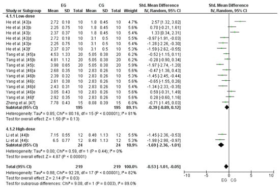 Five studies were considered for this analysis [,,,,]. Concerning high-dose LmW, the research by Li et al. [] was considered two independent studies because it considered two EGs (b and c). Concerning low-dose LmW, the research by He et al. [] was considered six independent studies since it considered six EGs (a, b, c, d, e, and f). The study by Tang et al. [] was considered three independent studies since it considered three EGs (a, b, and c). The research by Yang et al. [] was considered as six independent studies because it considered six EGs (a, b, c, d, e, and f). Finally, Zheng et al. [] was considered one independent study since it considered one EG. Consequently, to calculate the high-dose effect of LmW on malondialdehyde, this meta-analysis considered the two comparisons as independent studies, showing an SMD = −1.69 (CI = 95%: −2.36–−1.01; p < 0.00001) and low heterogeneity among the studies reviewed (I2 = 0%; p < 0.00001). Likewise, to calculate the low-dose effect of LmW on malondialdehyde, this meta-analysis considered the sixteen comparisons as independent studies, showing an SMD = −0.39 (CI = 95%: −0.89–0.12; p = 0.13) and a high heterogeneity among the studies reviewed (I2 = 81%; p < 0.00001). When analyzing all the studies, there was an SMD = −0.53 (CI = 95%: −1.01–−0.05; p = 0.03) and a high heterogeneity among the studies reviewed (I2 = 82%; p < 0.00001), with significant differences between subgroups (p = 0.003). Figure 6 shows the effects of LmW on malondialdehyde concentrations.