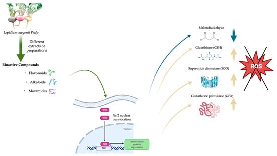 Antioxidant effects of Lepidium meyenii Walp (Maca) bioactive compounds on cellular oxidative stress. The figure illustrates how extracts and preparations of Maca, rich in flavonoids, alkaloids, and macamides, could activate the Nrf2 transcription factor signaling pathway. This activation leads to the nuclear translocation of Nrf2 and subsequent expression of antioxidant genes. The induced antioxidant proteins, such as superoxide dismutase (SOD) and glutathione peroxidase (GPX), increase reduced glutathione (GSH) and help to neutralize reactive oxygen species (ROS), thereby decreasing malondialdehyde (MDA) levels and mitigating oxidative damage in cells.