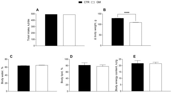 Metabolic profile in control and goat milk-treated rats. Daily food intake at the end of treatment (A), body weight (B), body water (C), lipid (D) and energy content (E) are reported. Data are presented as means ± SEM from n = 8 animals/group. **** p < 0.0001 goat milk (GM) vs. control (CTR).