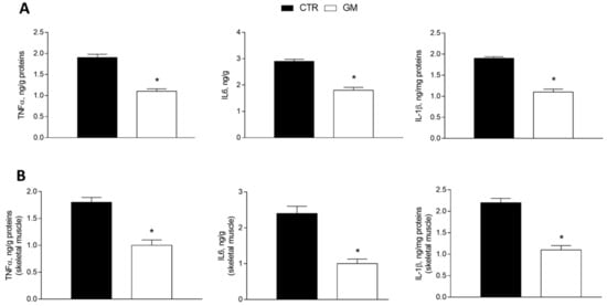 The levels of proinflammatory markers (tumor necrosis factor, TNF-α; interleukin-6, IL-6; and interleukin-1β, IL-1β) were significantly reduced in the liver homogenate from GM-supplemented rats compared to the control group (Figure 2A). The same effect was observed in the skeletal muscle homogenate of the GM group, which displays lower levels of inflammatory cytokines compared to the control group (Figure 2B).