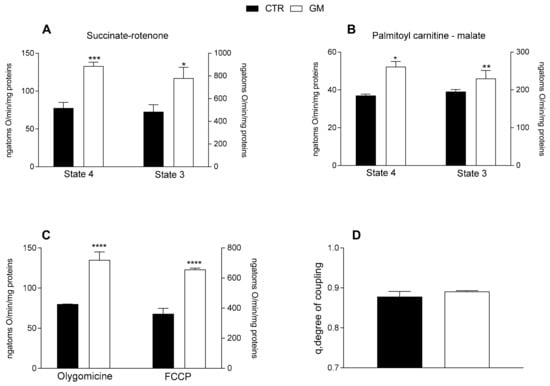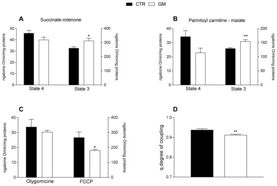 Mitochondrial state 3 respiration, evaluated using succinate or palmitoyl-carnitine as substrates (to detect fatty acid oxidation), of mitochondria isolated from the liver of GM-treated rats was increased compared with the control group (Figure 3A,B). No difference was observed in the oxygen consumption rate among the two groups after the addition of olygomicin, but a decrease in the GM-treated group was observed when the uncoupler FCCP was added (Figure 3C). Consequently, a lower mitochondrial coupling degree was observed in the GM-treated group than in control rats (Figure 3D).