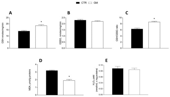 Hepatic oxidative stress profile in control and goat milk-treated rats. Reduced (GSH) and oxidized (GSSG) glutathione content (A,B), GSH/GSSG ratio (C), MDA levels (D), and H2O2 yield (E) were evaluated in hepatic tissue. Data are presented as means ± SEM from n = 8 animals/group. * p < 0.05 goat milk (GM) vs. control (CTR).