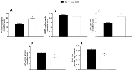 GM treatment improved the antioxidant state in both the liver and skeletal muscle (Figure 5 and Figure 6). Indeed, while GSH levels significantly increased in GM-treated animals, compared to the control group (Figure 5A and Figure 6A), GSSG content did not change (Figure 5B and Figure 6B), resulting in an increased GSH/GSSG ratio in the GM group (Figure 5C and Figure 6C). In addition, malondialdehyde (MDA) levels also decreased in the GM group in both the liver and skeletal muscle (Figure 5D and Figure 6D). In isolated mitochondria, we also evaluated the H2O2 yield, an indirect index of ROS production, observing no variation in the mitochondria of hepatic tissue (Figure 5E), while a significant reduction in the release of H2O2 was observed in skeletal muscle (Figure 6E).