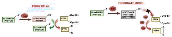 H2O2 can oxidize target proteins, such as PTEN [], through two alternative mechanisms: the “redox relay” or the “floodgate model”. In the first case [], through a two-step process, the scavenging enzymes (viz., peroxiredoxins, which are characterized by high H2O2 reactivity), after being in contact with H2O2, transfer the oxidation to the target proteins through the formation of a mixed disulfide bond between the scavenging enzymes and the interacting protein itself; interestingly, in this proposed model, the reduction in peroxiredoxins causes a decrease in the H2O2-induced oxidation of redox-regulated proteins instead of inducing an increase. In the floodgate model [], the hyper-oxidation of peroxiredoxins, due to rapid and localized increases in H2O2, decreases the peroxidase activity, inducing an accumulation of H2O2 available for oxidation of less sensitive proteins within this redox microenvironment (Figure 1).