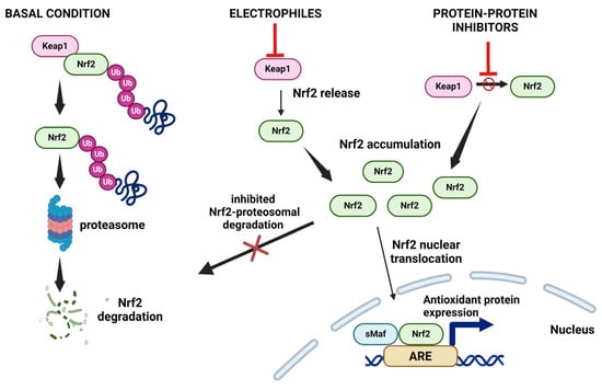 Electrophiles and protein–protein inhibitors modulation of the Keap1–Nrf2 system. Left panel: Under basal conditions, Nrf2 is constantly ubiquitinated through Keap1 and degraded in the proteasome. Right panels: When exposed to electrophiles (Keap1 inactivated) or protein-protein inhibitors (Keap1–Nrf2 binding inhibited), stabilized Nrf2 accumulates in the nucleus and activates transcription of antioxidant genes. Ub, ubiquitin. Image created with Biorender.com.
