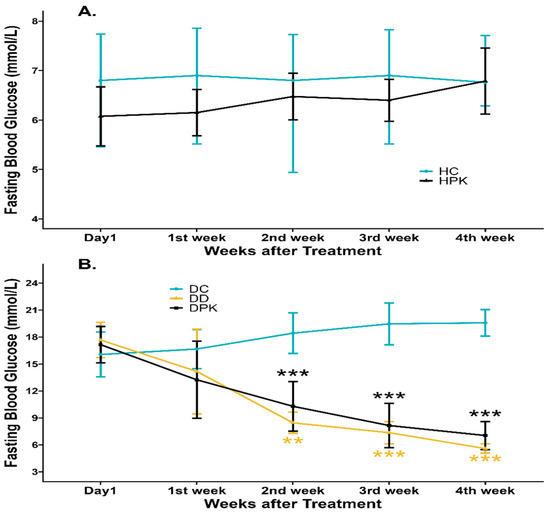 Fasting blood glucose levels of different intervention groups (n = 8) at each time point ((A). Intervention in healthy groups, (B). Intervention in diabetes groups). Here, HC: healthy control; HPK: healthy rats treated with plu kaow; DC: diabetic control; DD: diabetic rats treated with glibenclamide; and DPK: diabetic rats treated with plu kaow [Results presented as mean with 95% CI, Output from repeated measure of ANOVA and p value indicates significant difference of blood glucose level at each time points when compared with Day 1. **: p < 0.01, ***: p < 0.001.