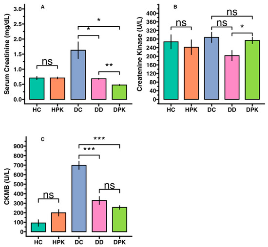 Evaluation of the effect of plu kaow ethanolic extract on cardiovascular, and renal function markers. Values are expressed as mean ± SD, (n = 8). HC (Healthy control); HPK (Healthy treated group); DC (Diabetic control); DPK (Diabetic treated group); DD (Diabetic drug group). Here, (A) indicates renal marker; (B,C) indicate cardiovascular markers; * p < 0.05, ** p < 0.01, *** p < 0.001, ns = non-significant.